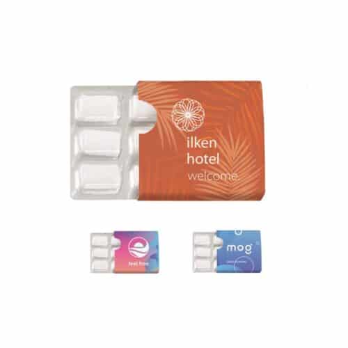 6 pezzi di gomma da masticare senza zucchero (16% xilitolo) in blister, confezionati in custodia scorrevole di cartone a colori.
