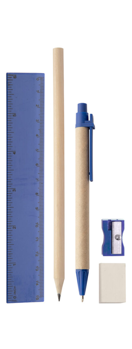 Set cancelleria da 5 pezzi, in scatola di cartoncino. Composto da penna a sfera in carta riciclata (con refill blu), matita temperata, righello da 15 cm, gomma e temperino. Dimensioni scatolina di 17,7 cm per 4,5, per 1,5 cm di spessore.
