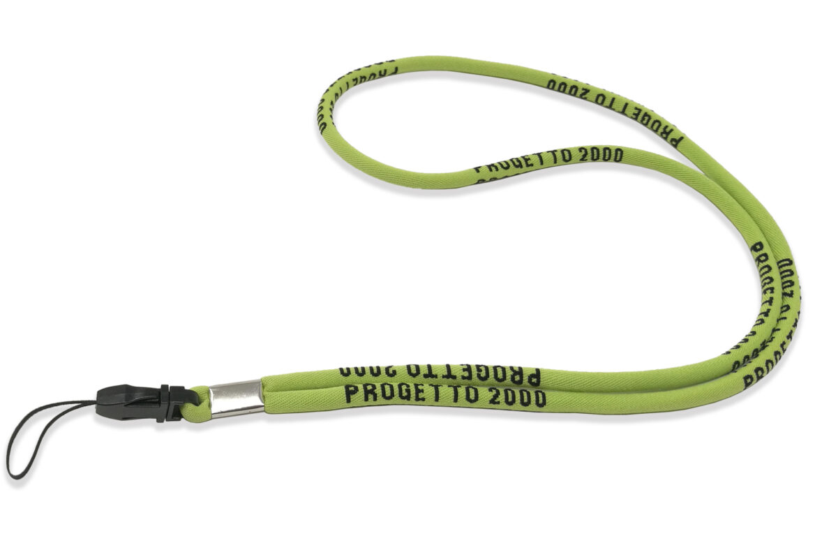 Portabadge da 6 mm a sezione tubolare, realizzato in poliestere con tessitura jacquard ad 1 colore nero su fondo verse a pantone. Munito di moschettoncino finale.