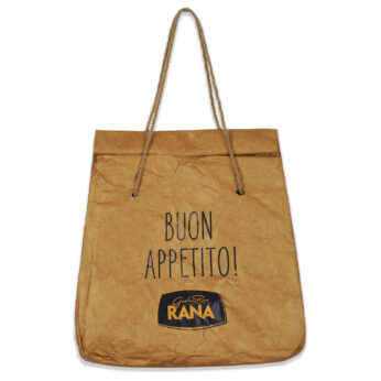 Shopper prodotta su misura in poliestere 420D con manici lunghi tricolore in nylon e personalizzazione su un alto tramite transfer in quadricromia.
