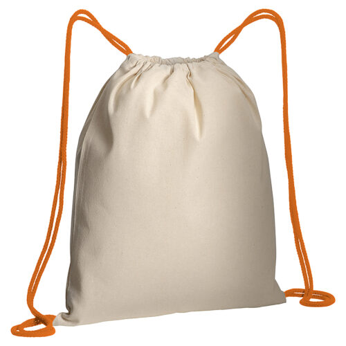 Drawstring zainetto realizzato in cotone naturale con chiusura a strozzo e cordini colorati fissati con asola.